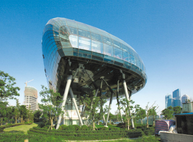 項目為上海國際客運中心航站樓——一滴水幕墻,離地13米,二樓登船廳長82米,寬31米,高28米,采用水滴觀光造型,配以低反射全玻璃幕墻,從遠處眺望,仿佛天上落下一滴湛藍色的水,晶瑩剔透。玻璃幕墻為不可解析異形曲面幕墻,包括球體上部、腹部及核心筒,被譽為黃浦江邊的“一滴水”。