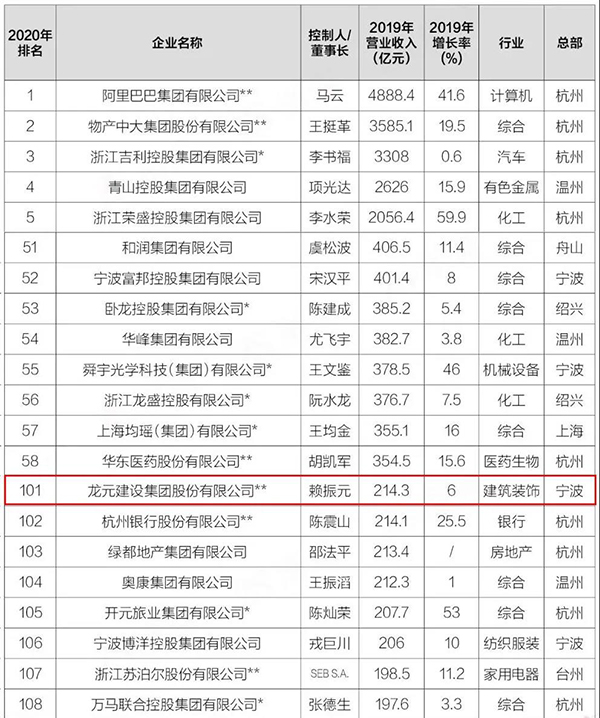 8月19日,望潮聽濤?浙商全國500強研討會在杭州舉行。會上,由《浙商》雜志獨家制作的“浙商銀行·2020浙商全國500強”榜單正式發布。龍元建設集團以214.3億元的營業收入榮列浙商全國500強第101位。