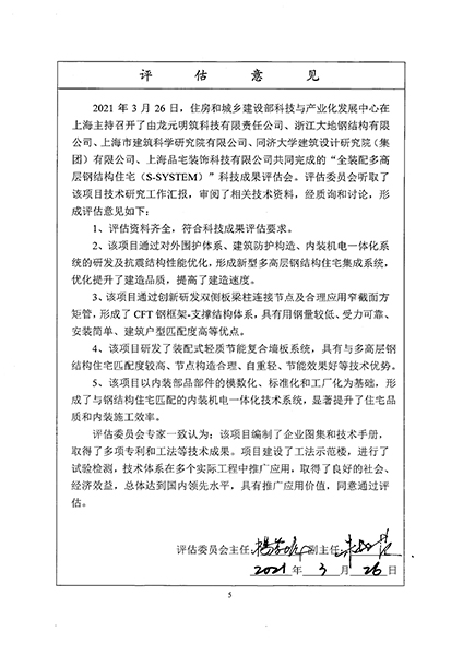 本次科技成果評估, S-SYSTEM體系獲得了住建部專家組的認可。專家組認為,研發團隊針對多高層鋼結構住宅開展了系列研究,基于裝配式技術與被動房技術的有效融合,通過對主體結構系統、外圍護系統、建筑防護構造、抗震性能優化及內裝機電一體化研究,形成新型多高層鋼結構住宅集成系統,并提供了從設計、制作、安裝全過程成套技術資料,創新亮點頗多,具有用鋼量較低、受力可靠、安裝簡單、建筑戶型匹配度高等優點,初步形成部品部件的模數化、標準化和工廠化基礎,優化提升了建造品質,提高了建造速度。