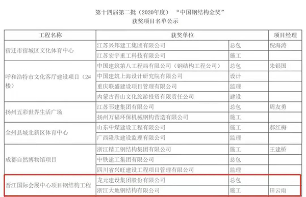 2021年4月,中國(guó)建筑金屬結(jié)構(gòu)協(xié)會(huì)公布了第十四屆第二批(2020年度)中國(guó)鋼結(jié)構(gòu)金獎(jiǎng)工程項(xiàng)目名單,全國(guó)首個(gè)會(huì)展類PPP項(xiàng)目、龍?jiān)瘓F(tuán)首個(gè)中標(biāo)的PPP項(xiàng)目——晉江國(guó)際會(huì)展中心鋼結(jié)構(gòu)工程榮獲第十四屆第二批“中國(guó)鋼結(jié)構(gòu)金獎(jiǎng)”。