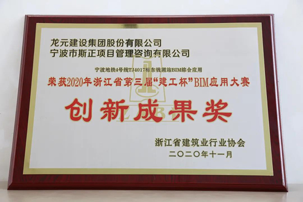 集團在2014年成立BIM中心,BIM技術在寧陽文化藝術中心、寧波地鐵4號線TJ4017標東錢湖站等多個項目展開試點應用,《寧波地鐵4號線TJ4017標東錢湖站BIM綜合應用》在第三屆“建工杯”BIM應用技術大賽中榮獲創新成果獎、綜合組銅獎;集團在浙江省建筑業技術創新協會組織的企業建筑信息模型(BIM)應用等級評定中獲得最高級別認定,被評為BIM應用等級一級。