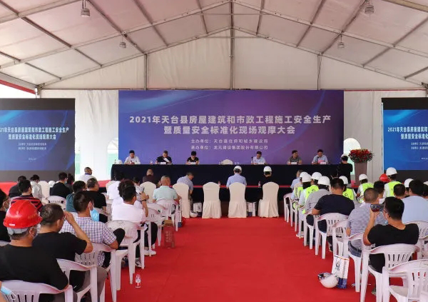 6月25日,2021年天臺縣房屋建筑和市政工程施工安全生產暨質量安全標準化現場觀摩會在龍元建設集團浙江天臺安置房PPP項目部舉行。本次活動由天臺縣住房和城鄉建設局主辦,龍元建設集團股份有限公司承辦。天臺縣住建局局長龐奎出席并致辭,縣公安局、應急局、交通局、水利局、執法局、消防救援大隊、始豐街道等分管領導參加,縣房開企業、施工企業、監理單位等同行企業,以及媒體代表等300余人走進施工現場,深入學習該項目在安全文明施工標準化、智慧工地建造等方面的優秀做法和經驗。
