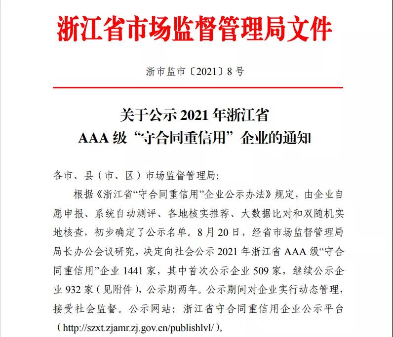 近日,浙江省市場監(jiān)管局向社會(huì)公示1141家企業(yè)為2021年浙江省AAA級(jí)“守合同重信用”企業(yè),其中首次公示企業(yè)509家,繼續(xù)公示企業(yè)932家。龍?jiān)瘓F(tuán)繼續(xù)獲評(píng)省AAA級(jí)“守合同重信用”企業(yè),這是集團(tuán)多年來一直堅(jiān)持守合同重信用工作、以誠信推動(dòng)企業(yè)發(fā)展的結(jié)果。