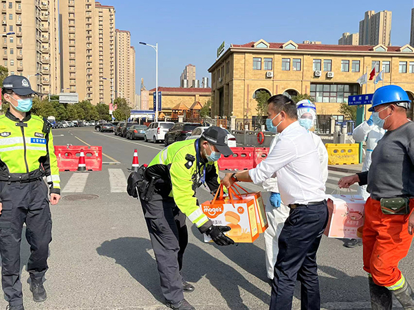 3月15日,龍?jiān)煜伦庸尽堅(jiān)⒑甓麻L(zhǎng)應(yīng)長(zhǎng)鉅和總經(jīng)理郭文明率隊(duì)前往寧波杭州灣新區(qū)的封控區(qū)域——世紀(jì)城汀香苑小區(qū),為仍然堅(jiān)守在防疫一線的工作者們送上水、面條、蛋糕等物資,對(duì)他們的艱苦付出表示衷心感謝和崇高敬意。