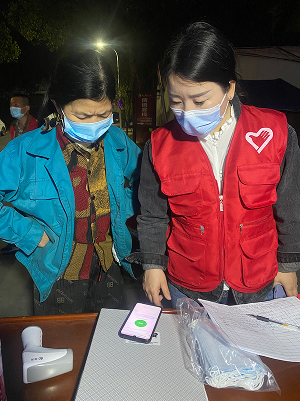 龍?jiān)姓B(yǎng)護(hù)項(xiàng)目資料員金紅霞在完成單位日常工作之后,主動(dòng)作為志愿者在村居出入口進(jìn)行健康碼、行程碼及核酸檢測(cè)報(bào)告檢查。