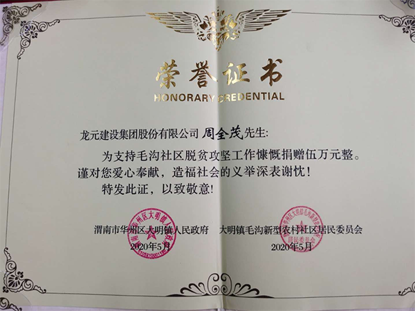 2017年9月,周全茂代表龍元集團向陜西渭南華州區捐贈10萬元,幫助了80名當地優秀大學生和困難學生,支持他們追尋夢想;