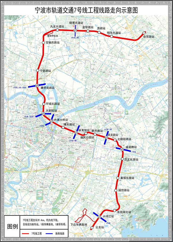 寧波軌道交通7號(hào)線,是寧波市城市軌道交通第三期建設(shè)規(guī)劃中的重要項(xiàng)目之一。7號(hào)線是寧波軌道交通主干線的輔助線,分擔(dān)城市南北向發(fā)展的客流。項(xiàng)目一期南起鄞州區(qū)云龍站,經(jīng)過(guò)下應(yīng)街道、東部新城、三江口和鎮(zhèn)海新城等重點(diǎn)區(qū)域,北至鎮(zhèn)海區(qū)俞范東路站。線路全長(zhǎng)39.4km,全部為地下站,全線設(shè)25座車(chē)站,線路分別在北端聯(lián)群設(shè)停車(chē)場(chǎng)1座和鄞州下應(yīng)設(shè)車(chē)輛基地1座,平均站間距1.6km。