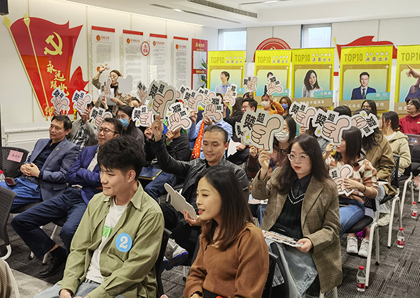 為了讓更多龍?jiān)嗄昴軌騾⑴c到活動當(dāng)中,本次「開放麥」決賽除了由5位專業(yè)評審打分外,還面向全集團(tuán)開放線上、線下共30個(gè)大眾評審席位,通過投票來對各位選手進(jìn)行打分。報(bào)名通道開啟后,龍?jiān)嗄陚儫崆楦邼q,30個(gè)名額很快一搶而空。決賽當(dāng)天,18名現(xiàn)場大眾評審和12名線上大眾評審認(rèn)真聆聽每一位選手的演說,親手選出了受到青年人認(rèn)可的“TALK KING”。
